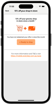 Download the Everyday Mobile from Woolworths from Woolworths app (make sure you are updated to the latest version) to view the 10% off your shop offer page. This page will tell you: